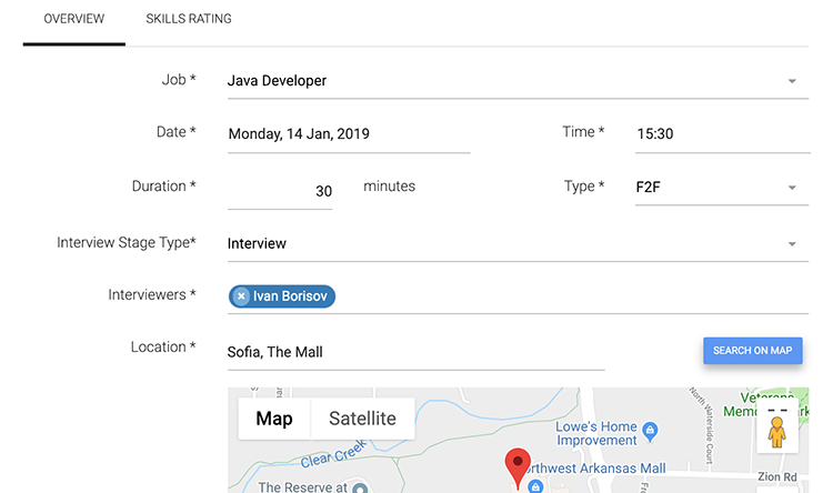 Your candidates, your recruitment team and you will be able to see the interviews and the feedback given by interviewers. Remember that each interview will change the rank for specific skills of your candidates. You can schedule interviews for your candidates and send them the meeting locations and information.