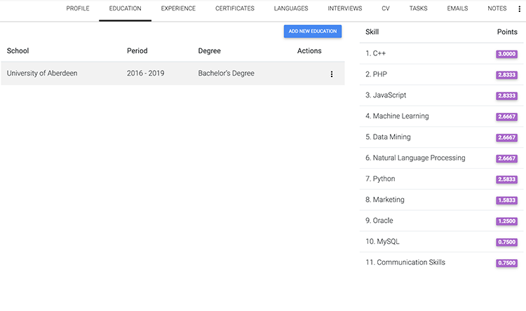 You can add skills to your candidates’ profiles associated to their experience, education, certifications, interviews and other steps in their professional career. All matters and all will be counted when you see our skill ranking of your candidates.